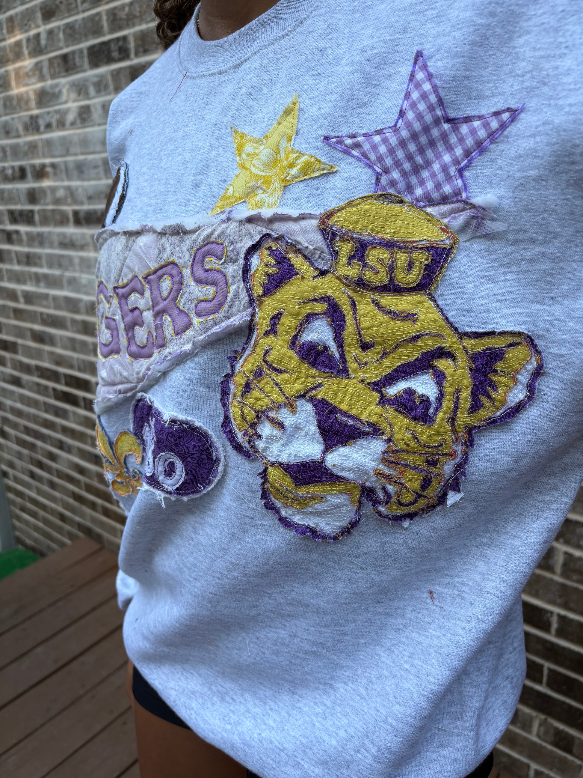this lsu sweatshirt is a 1 of 1!! all the patches have been handmade, which is reflected in the price. please note that some of the patches have been made from thrifted materials!!